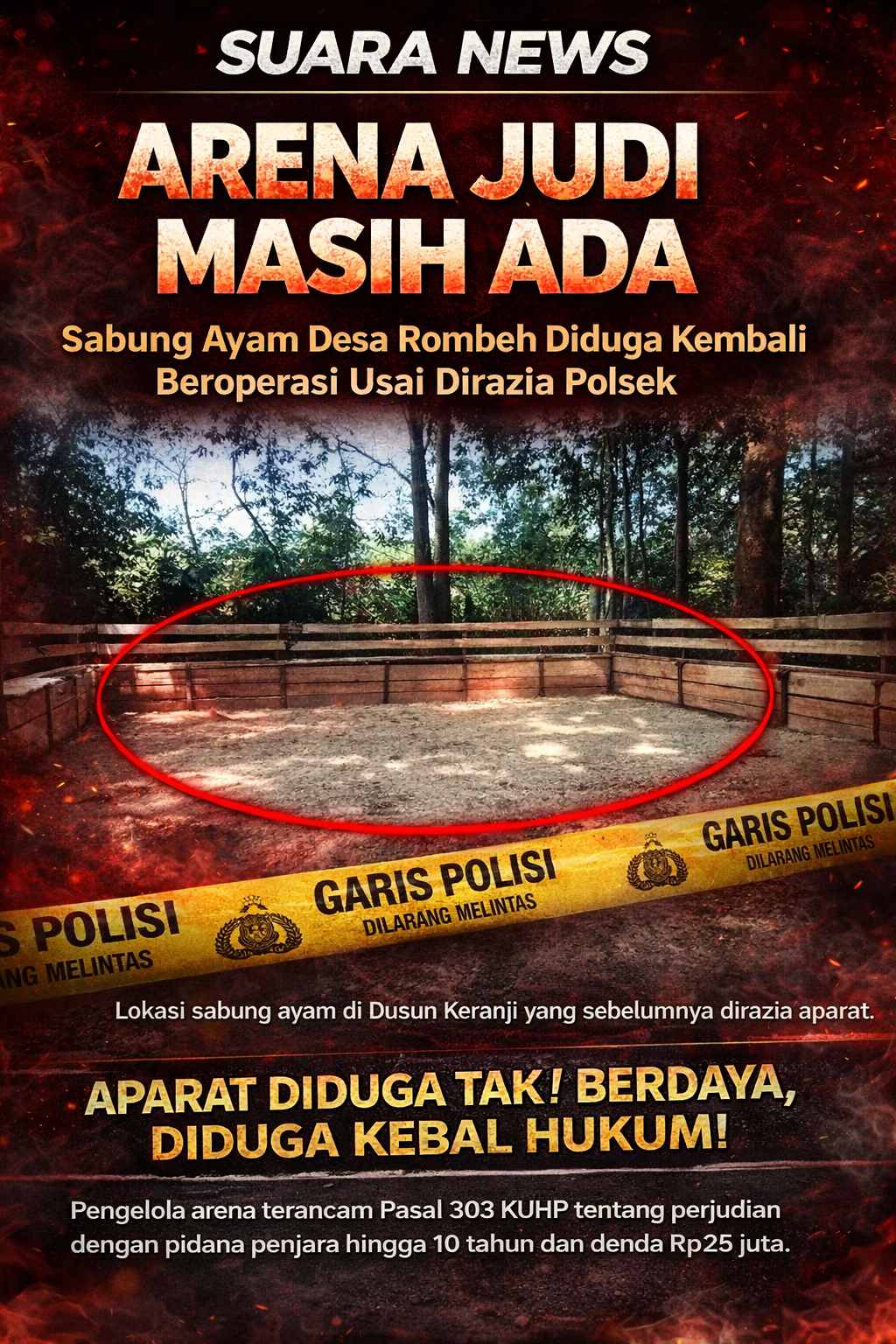 Masyarakat mendesak agar aparat kepolisian tidak hanya melakukan razia sesaat, tetapi juga menindak tegas para pengelola dan aktor utama di balik aktivitas judi sabung ayam tersebut, agar hukum benar-benar ditegakkan dan memberikan efek jera.